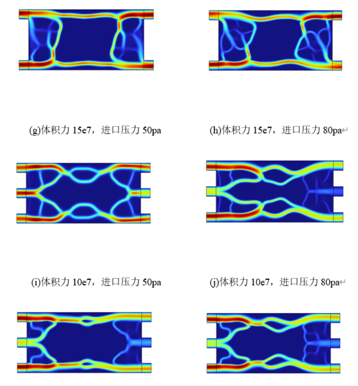 该项目对电动汽车普及背景下动力电池热管理的关键挑战,以提升液冷系统核心部件水冷板的散热性能为目标,基于COMSOL Multiphysics构建电池包水冷板二维流动传热拓扑优化模型,采用 SIMP 插值法实现材料导热系数插值、MMA 优化算法求解,系统分析进出口数量、进出口位置(对角型与同侧型)及单 多目标优化对水冷板性能的影响。单目标优化表明,增大体积力、进口压力或增加进出口数,可使流道更复杂、温度更低;多目标优化(以平均温度、流体动力耗散、温度方差为目标)显示,相同条件下四进出口水冷板温度最低,较单进出口降温效果显著。优化后流道呈仿生分层布局,有效改善流速不均、降低最高温度与压降,为电动汽车电池热管理系统升级提供重要理论支持与技术参考。