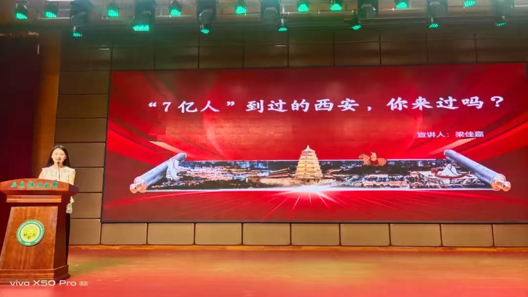 “同学们,‘7亿人’到过的西安,你来过吗?”西安市新时代文明实践理论宣讲团成员梁佳嘉首先将问题抛给现场同学,引发讨论。“我们要坚定文化自信,弘扬城市文明。”梁佳嘉说,“历史让一片土地厚重,而文化让一方水土浪漫,这就是文化的力量。”