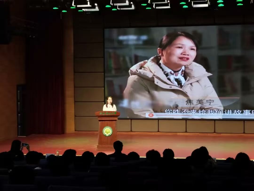 临潼潼心声宣讲团成员梁瑾妍分享了全国“乡村阅读榜样”焦美宁的故事。“9年的公益之路,从一个人到一群人,她每周都会去乡村小学给孩子们讲四节以上的绘本故事,足迹遍布了400多所学校,累计行程达两万多公里。”梁瑾妍娓娓道来。