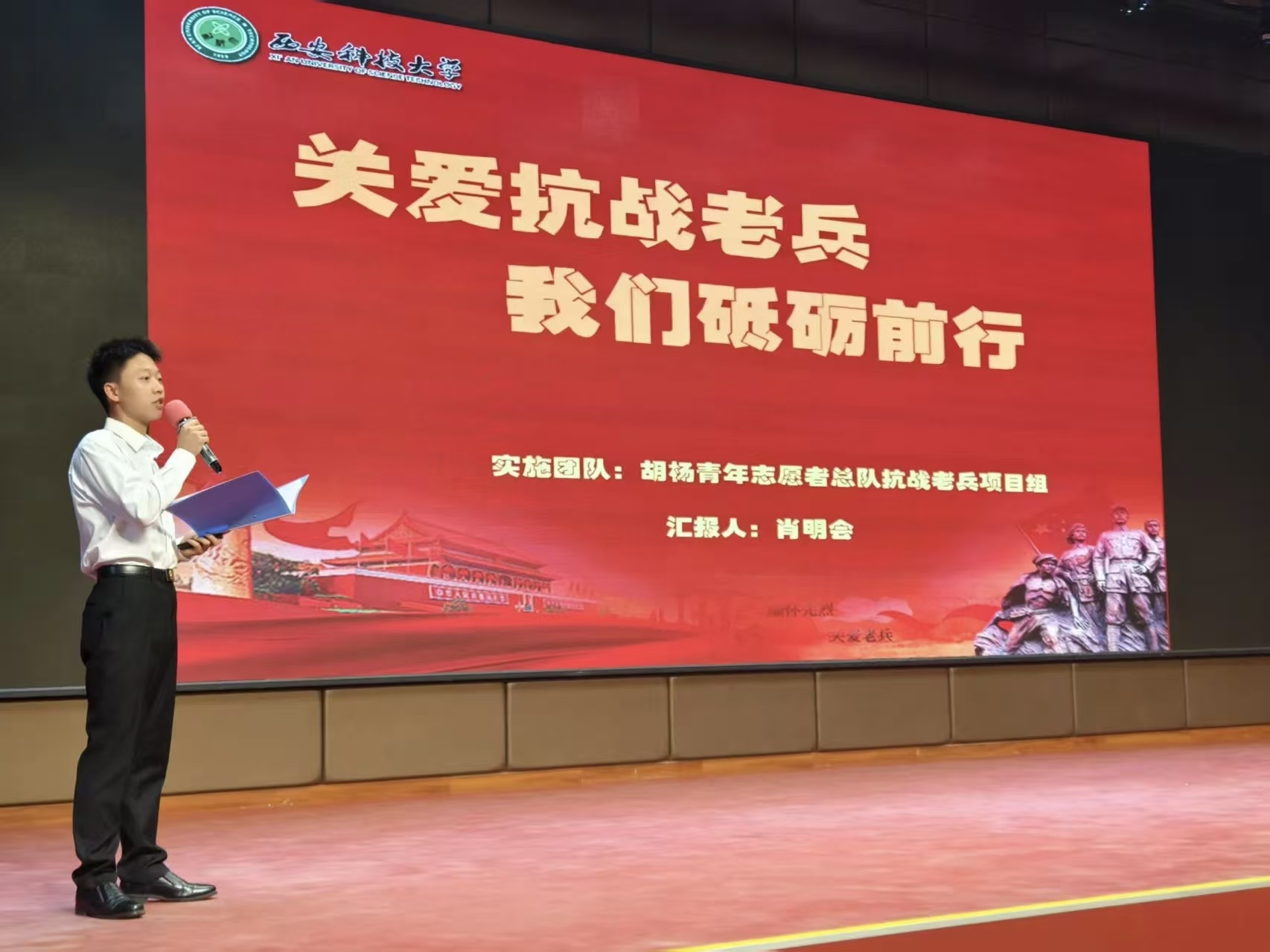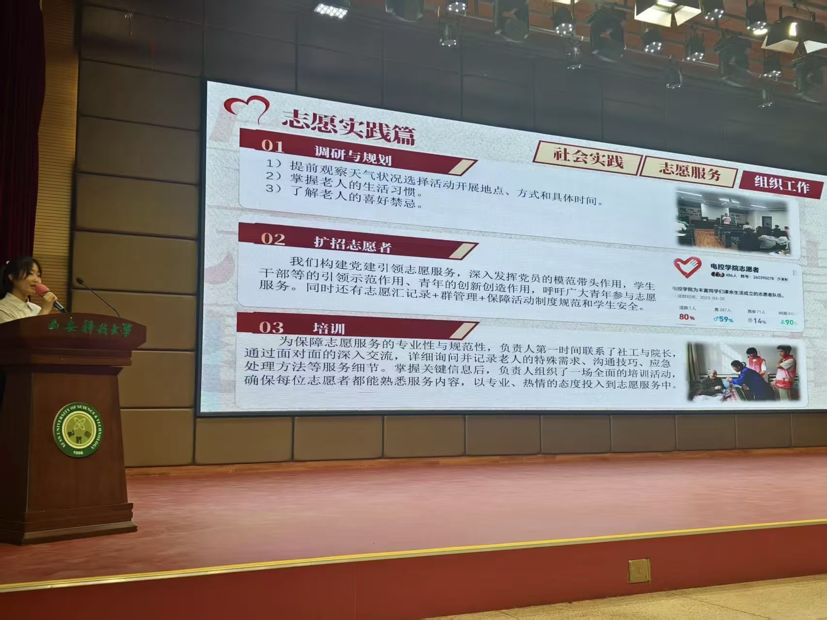 决赛现场,各团队通过PPT汇报、短视频展示、实物演示等多元形式,系统清晰地呈现了项目的目标定位、实施路径、创新亮点与社会成效。团队成员精神饱满、表达流畅,充分展现出志愿服务应有的温度与专业水准,彰显了西科青年扎根现实、服务社会、团结协作、勇于创新的优良风貌。