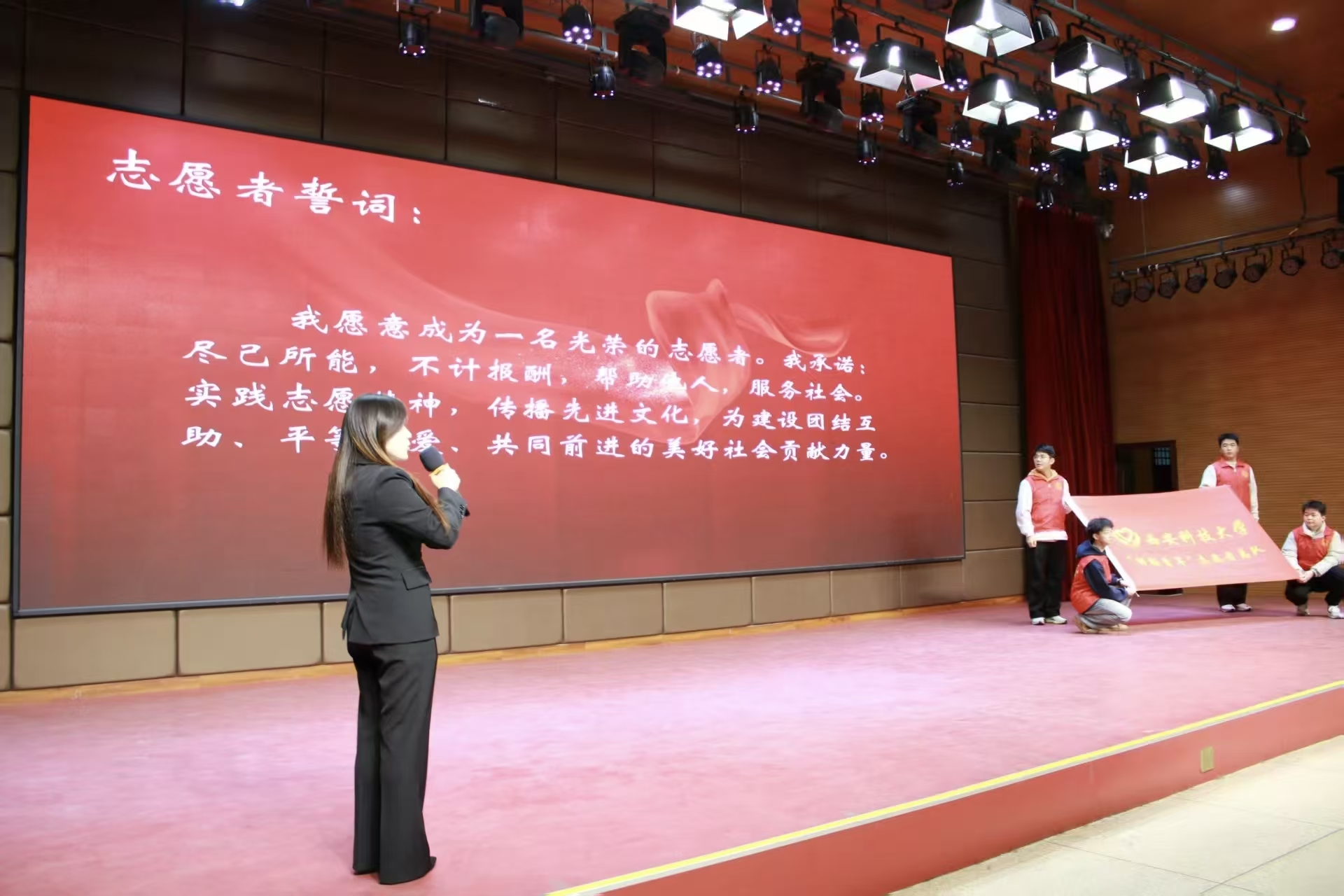 整个全体会议历经了共唱志愿者之歌、上届主席团表发言、授旗+志愿者宣言、主席团代表发言、各部门代表发言、大二干部代表发言、大一干事代表发言、节目表演、合影留念九个环节。胡杨花们积极开放,志愿者总队的旗帜永远高高飘扬,愿志愿精神薪火相传、生生不息。