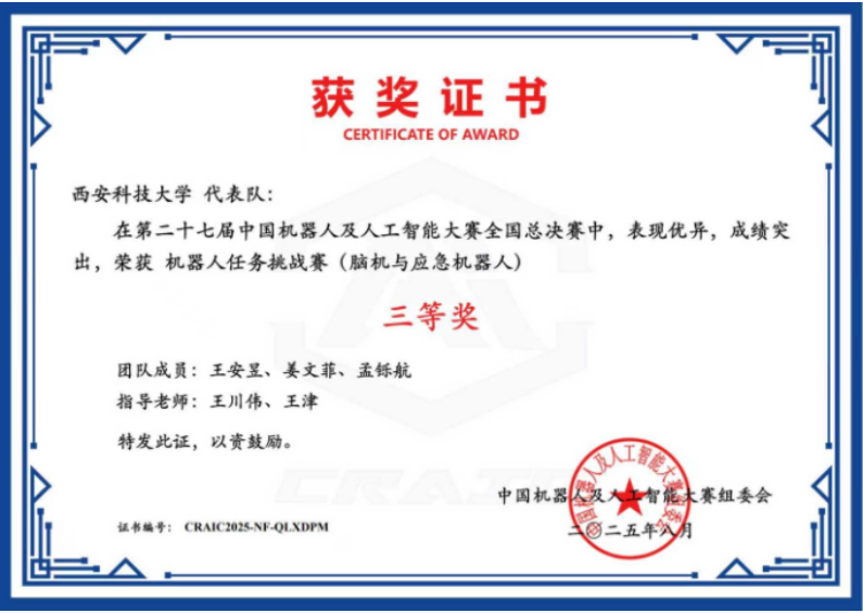 近日,第二十七届中国机器人及人工智能大赛全国总决赛落幕。由机械工程学院王川伟、王津两位教师指导,王安昱、姜文菲、孟铄航等本科生组成的参赛队,凭借出色创新与扎实技术实力入围国赛——机器人任务挑战赛脑机与应急机器人赛道,累计获国家级三等奖1项、省级二等奖1项、三等奖1项。该赛事2020年入选《全国普通高等学校学科竞赛排行榜》,是我国智能技术领域最具影响力的大学生竞赛之一,聚焦“人工智能+”“机器人+”,旨在培养创新实践与团队协作能力。我校团队历经数月合作,搭建三轴机械臂智能物流运输平台,实现颜色识别、自主避障与导航等算法,充分展现学校在新工科建设和创新创业教育中的成效。机械工程学院将继续深化教育、科技、人才“三位一体”改革,落实以赛促教、以赛促学、以赛促创,培养高素质创新型人才,为学校“双一流”建设贡献力量。