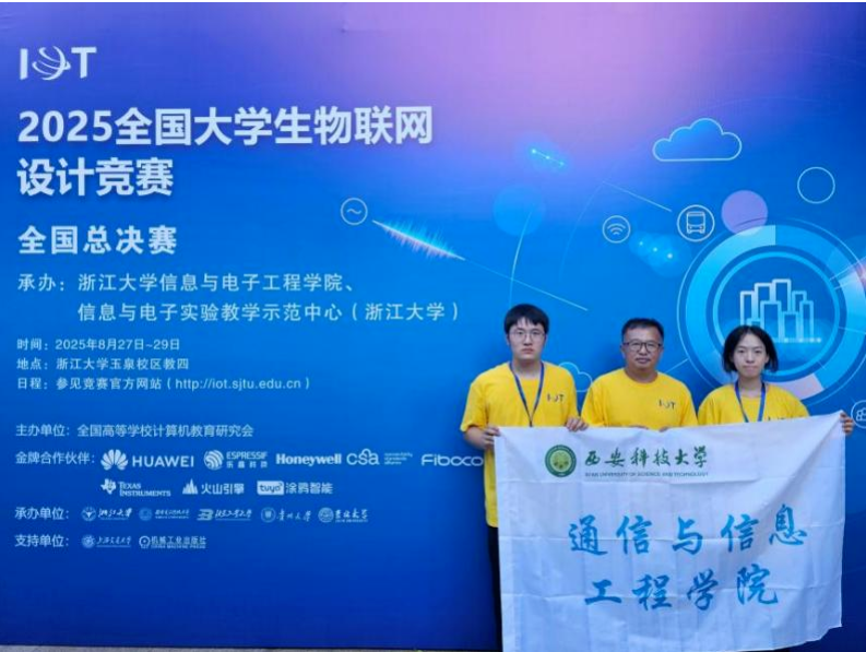 近日,2025年全国大学生物联网设计竞赛全国总决赛在浙江大学举行。西安科技大学代表队表现优异,荣获全国一等奖1项、二等奖2项,实现国家一等奖“零的突破”,获奖总数位列陕西高校第二。该竞赛由教育部计算机类专业教指委发起、全国高等学校计算机教育研究会主办,并列入中国高等教育学会《全国普通高校大学生学科竞赛排行榜》,是物联网领域规模最大、认可度最高的国家级赛事。本届共有800余所高校、3200余支队伍参赛。为备赛,学校于5月10日举办首届校内竞赛,共285名师生、81支队伍参与,遴选出12支队伍参加西北赛区。8月16日至17日赛区赛事中,我校获一等奖5项、二等奖4项,3支队伍晋级全国赛。8月27日至29日总决赛中,选手们发挥出色,取得历史性突破,充分展现了我校物联网技术创新实力与学科建设成果。