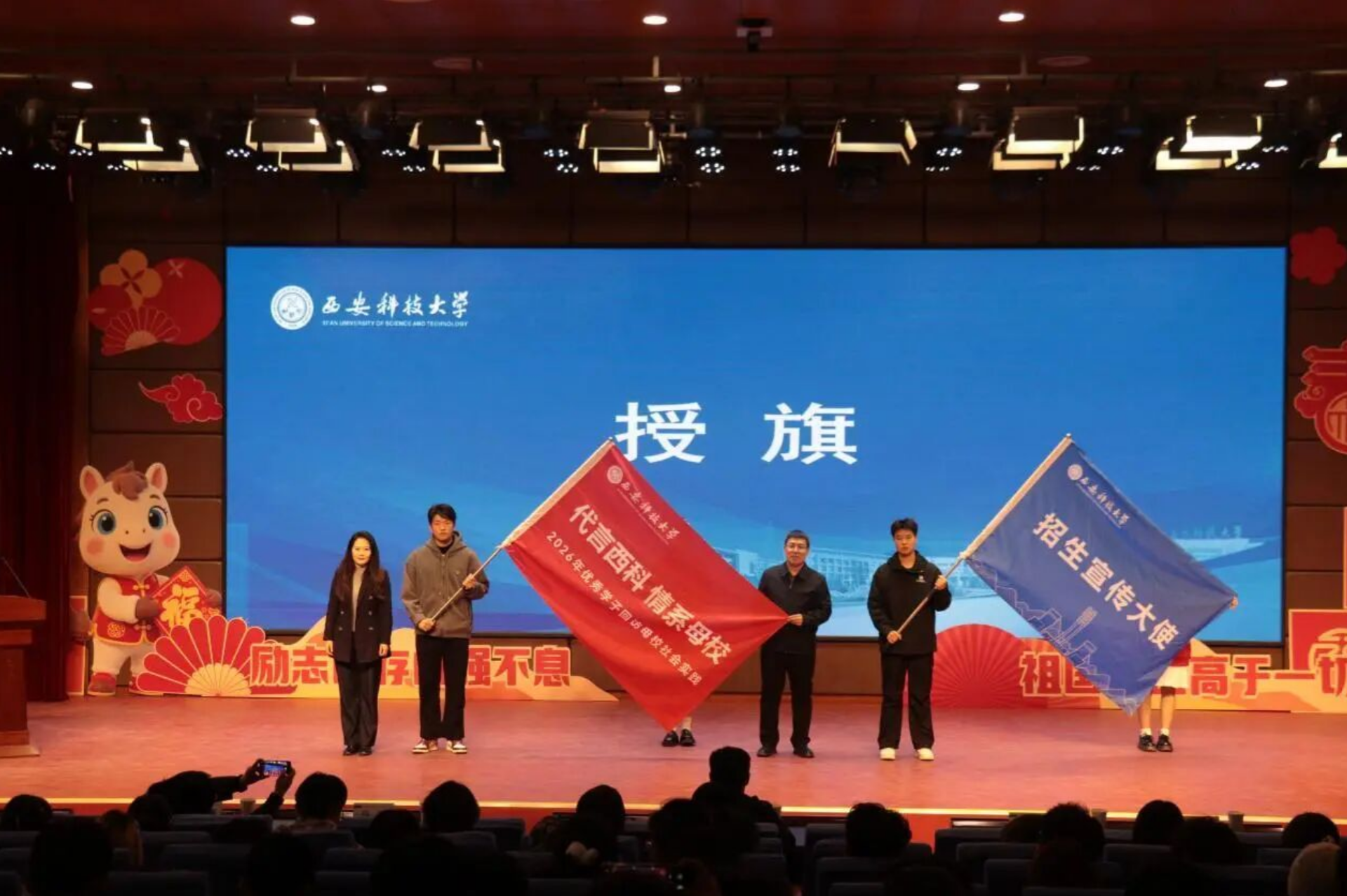 高欣、赵兵朝共同为2026年寒假“优秀学子回访母校”专项社会实践的学生代表授旗。队旗迎风展开,标志着新一轮实践活动正式启程。